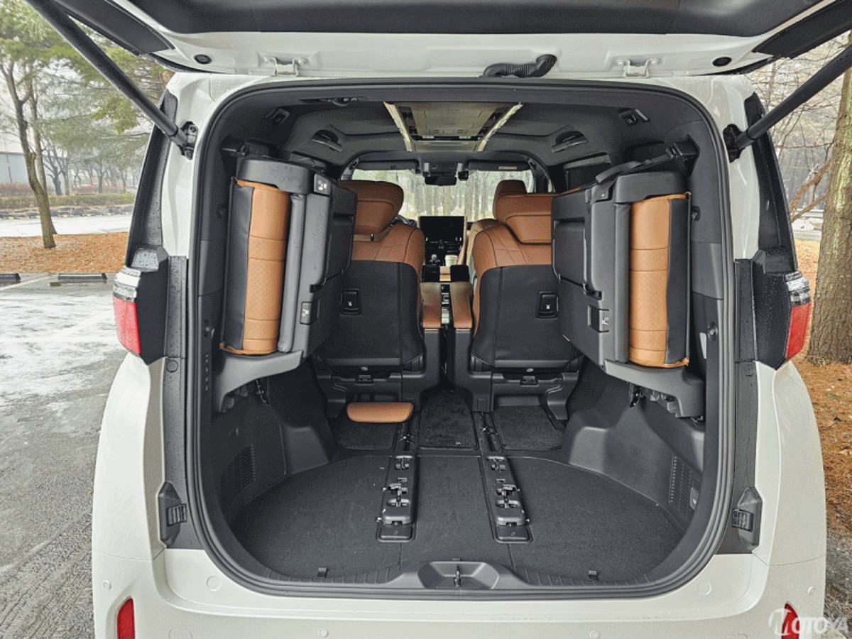 3열 좌석은 접어서 짐공간을 늘리는 데에도 활용할 수 있는데, 접히는 방식이 독특하다. 기아 카니발의 4열좌석에서 사용하는 스토우 앤 고(싱킹시트) 방식도 아니고, 3열좌석에서 사용하는 팁업 방식도 아니며, 심지어 더블폴딩조차 아니다. 알파드의 3열좌석은 구식 SUV에서나 볼 법한 5:5 좌우 분할 접이식이다! 이 방식은 양쪽의 좌석을 위쪽으로 올려 접은 후에 벨트로 고정하는 방식으로, 대단히 고전적이긴 하지만, 시트를 바닥에 수납하는 것 못지않게 광활한 공간을 만들어낼 수 있다.
