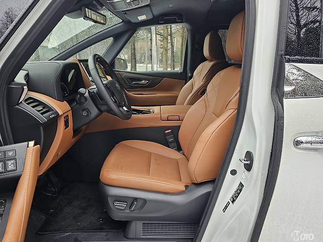 앞좌석은 알파드의 차내에서 가장 높은 자리에 위치해 있다. 이렇게 된 이유는 1열좌석 하단에 하이브리드 배터리가 수납되는 방식을 취했기 때문이다. 하지만 차량의 전체 높이 등을 고려했을 때, 지나치게 낮거나 높지 않은, 적정한 선에서 시트포지션을 잡은 모습이다. 특히 글로벌 아키텍처 기반의 차량들은 시트 레일이 차량의 바닥구조에 직접 체결되어 있는 방식을 사용해, 체감 상으로 그다지 높지 않게 느껴진다. 앞좌석의 착좌감은 대체로 편안한 느낌이며, 장시간의 주행에도 피로감이 적은 편이다. 앞좌석은 기본적인 8방향 전동조절 기능을 제공하고, 열선 및 통풍 기능도 적용된다. 그러나 운전석에 전동식 요추받침이 빠져있다는 점은 다소 아쉬운 부분이다.