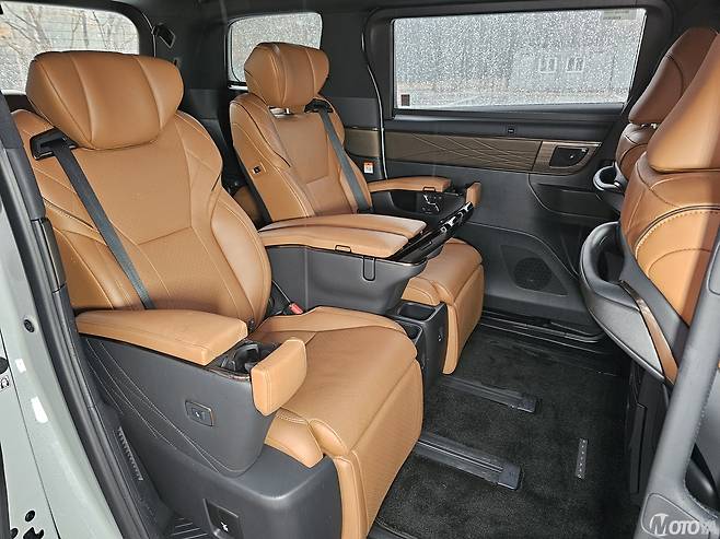 그리고 VIP 의전용으로 특별히 제작된 2열의 오토만 시트는 최상의 편안함을 제공한다. 체감 상으로 좌석의 높이가 제법 있는 편인데, 토요타에서는 처음부터 의도적으로 가정용 소파에 해당하는 높이로 설계했다고 한다. 그리고 그 약간 높은 듯한 시트의 아래에는 극상의 쾌적함을 선사하기 위한 다양한 기능들이 숨어 있다. 먼저, 2열 좌석에는 열선, 통풍, 그리고 마사지 기능이 모두 적용되어 있을 뿐만 아니라, 하단에는 차체에서 시트로 전달되는 진동을 잡아내기 위한 전용 마운트까지 내장하고 있다. 이 덕분에 앞좌석이나 3열좌석과는 비교도 되지 않는 승차감을 선사한다.