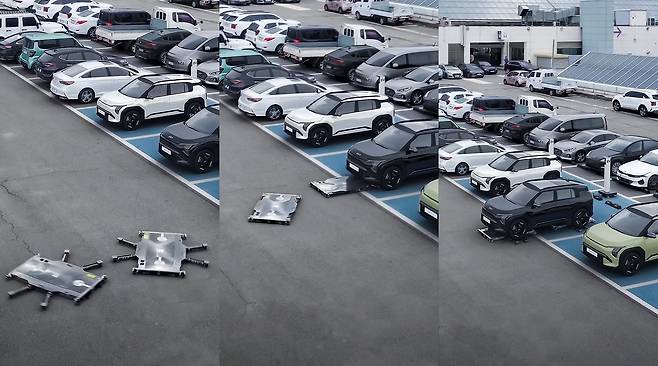 주차 로봇의 두께는 단 110mm. 세단, SUV, 전기차 등 다양한 차종의 하단부로 진입이 가능하도록 초슬림 구조로 설계됐다. 차량의 바퀴 위치는 AI 센서가 자동으로 인식하고, 로봇 팔이 이를 정확히 들어 올린다.