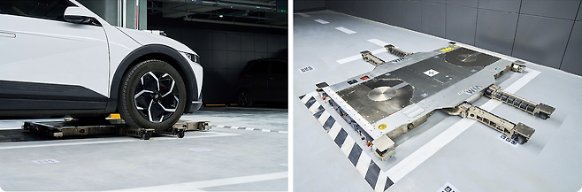 현대차그룹의 첨단 주차 기술인 ‘듀얼 주차 로봇 시스템’은 차량의 바퀴 아래로 진입해 들어 올린 뒤, 차량을 원하는 위치로 이동시키는 방식이다. 두 대의 로봇이 한 쌍으로 움직이기 때문에 차량을 앞뒤뿐 아니라 좌우로도 자유롭게 이동시킬 수 있다.
