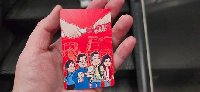 교통카드를 샀습니다. 공산당 선전포스터가 그려져 있습니다. 50위안(1만원)충전하고 1주일 내내썼습니다.