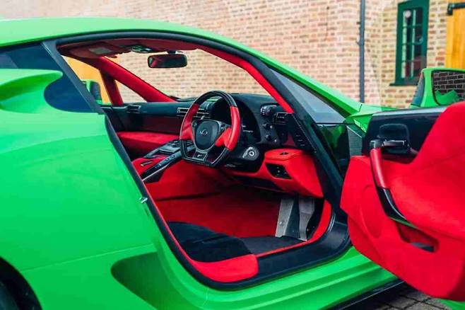 이 LFA는 시원한 초록색 외장뿐 아니라 강렬한 빨간색 가죽 실내로도 주목받고 있습니다. 알칸타라 가죽이 적용된 실내는 도어 패널, 필러, 변속기 터널까지 빨간색 가죽으로 장식되었으며, 시트는 검정색과 빨간색이 섞인 알칸타라로 마무리되었습니다. 외관의 고급스러움과 실내의 강렬한 디자인이 완벽한 조화를 이루고 있습니다.