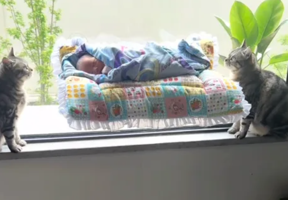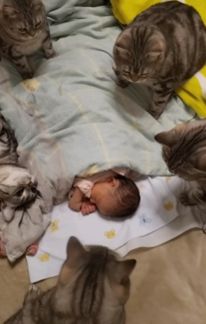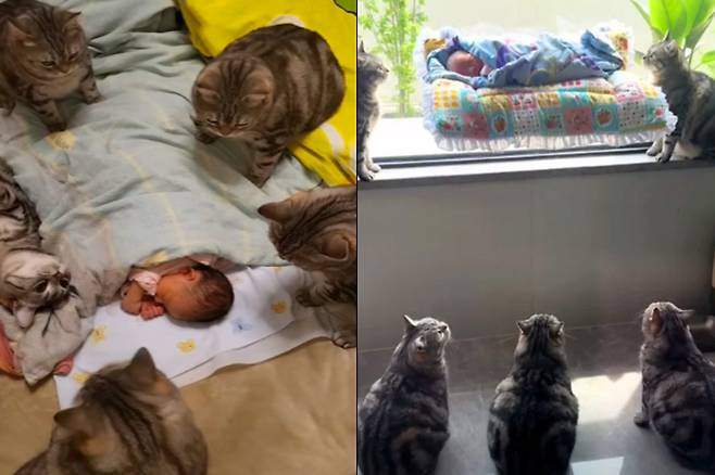 중국 산시성의 한 반려가정에서 태어난 둘째 아이가 뜻밖의 ‘특급 경호’를 받고 있다. 보호자가 키우는 다섯 마리 아메리칸 쇼트헤어 모두 애칭이 ‘러러’인 이 고양이들은 신생아가 잠들기만 하면 침대 주변으로 모여들어 호기심 가득한 눈빛으로 둘러싼다. 마치 아기를 감싸는 장벽처럼 자리 잡아, 온라인에서는 “ 안전감이 장난 아니다”라는 반응이 쏟아졌다.