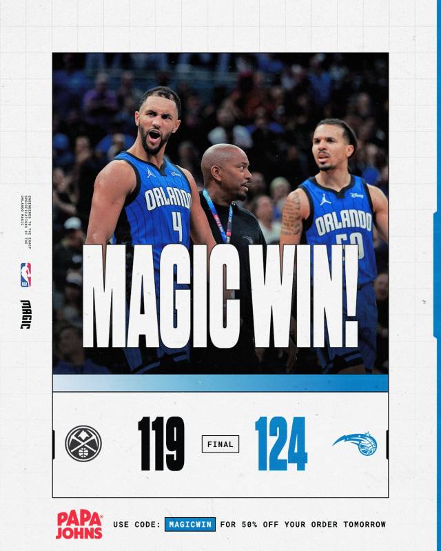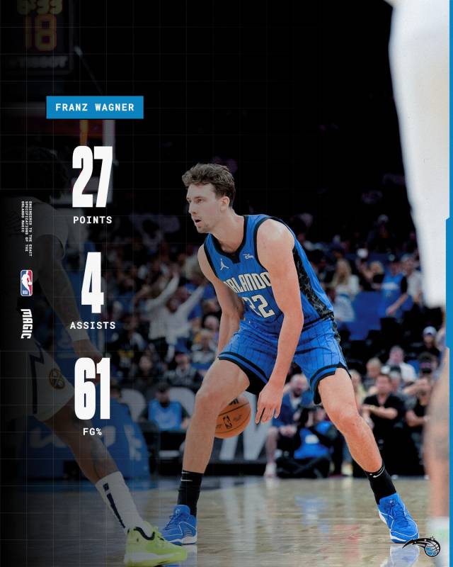올랜도는 독일 출신의 포워드 프란츠 바그너가 후반에만 24득점(총 27득점)을 기록했고 파올로 반케로(23득점)와 콜 앤서니(20득점)가 제 몫을 해내며 트리플 더블을 기록한 요키치(30득점 13리바운드 12어시스트)의 덴버를 꺾고 5연승에 성공했다.