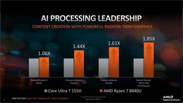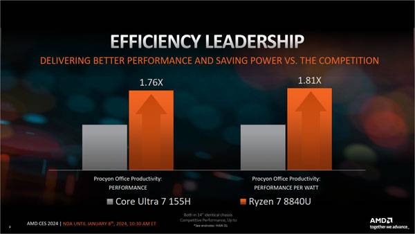 지난해 라이젠 8040 발표 당시에는 인텔의 메테오 레이크가 정식 출시되기 전이었던 만큼 AMD의 전 세대 제품과의 비교 자료만을 공개했었는데, 2024년 시점에서는 AI 엔진이 탑재된 메테오 레이크 기반 시스템이 판매 중이라 그와 비교한 성능 지표를 공개했다.