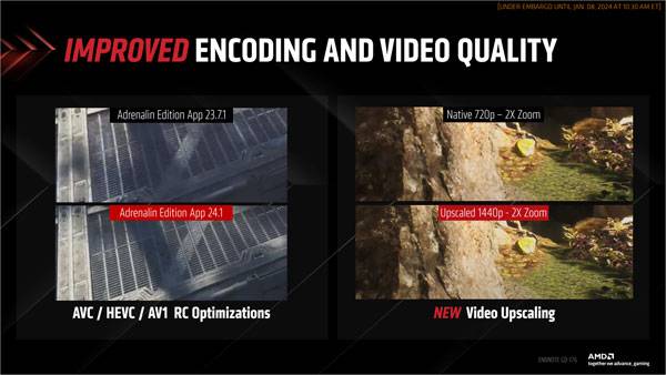 한편, AMD는 경쟁사에 비해 게임 영상 녹화 및 방송 품질을 좌우하는 인코더가 지적받아 왔는데, AFMF 정식 지원과 더불어 인코더 품질 개선을 발표했다. 여기에 영상 업스케일링 기술로 새롭게 지원, 단순히 게임 성능만이 아니라 그래픽 경험 개선을 위해 지속적으로 노력하고 있음을 어필했다.