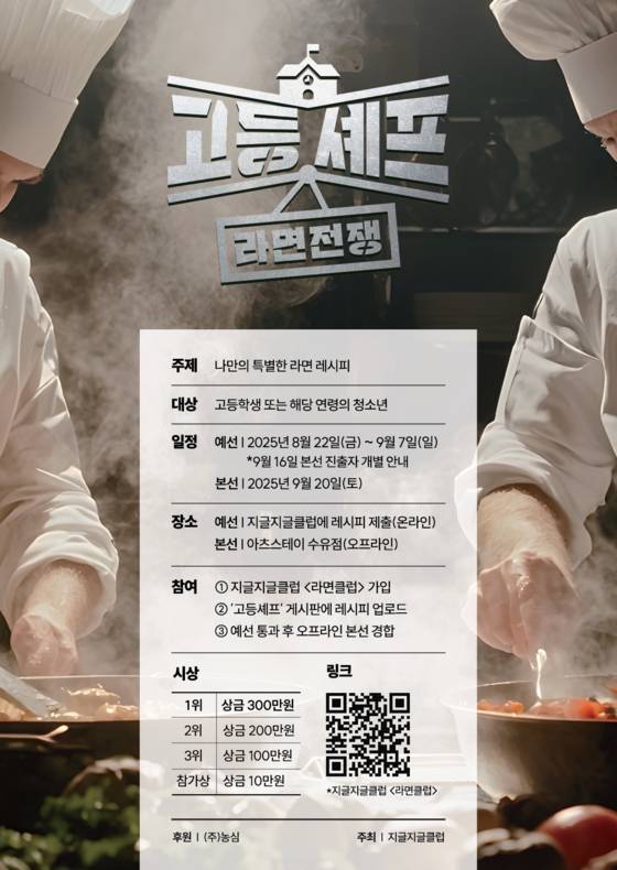 대회는 예선과 본선 두 단계로 나뉜다. 온라인으로 치러지는 예선 주제는 ‘나만의 라면 레시피’다. 참가자는 농심의 신라면, 안성탕면, 너구리, 짜파게티, 신라면 툼바 중 하나를 선택해 자신만의 레시피를 완성하면 된다. 응모 방법은 간단하다. 9월 7일(일)까지 식문화 소셜커뮤니티 지글지글클럽 ‘라면클럽’ 내 고등셰프 게시판에 완성된 요리 사진과 레시피를 등록하면 자동으로 접수된다.