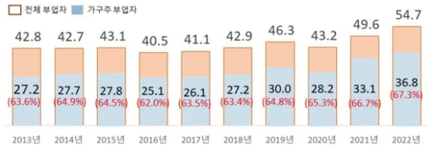이중 가정 생계를 책임지는 가장 부업자 수는 36만 8,000명으로 역대 최고를 기록했는데요. 2017년 26만 1,000명과 비교해 5년 새 무려 41%나 증가했습니다.