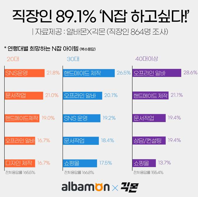 아르바이트 포털 알바몬과 재능거래 앱 긱몬이 직장인 864명을 상대로 조사한 결과 응답자의 89.1%가 '재능을 살려 부업을 해보고 싶다'고 답했습니다.