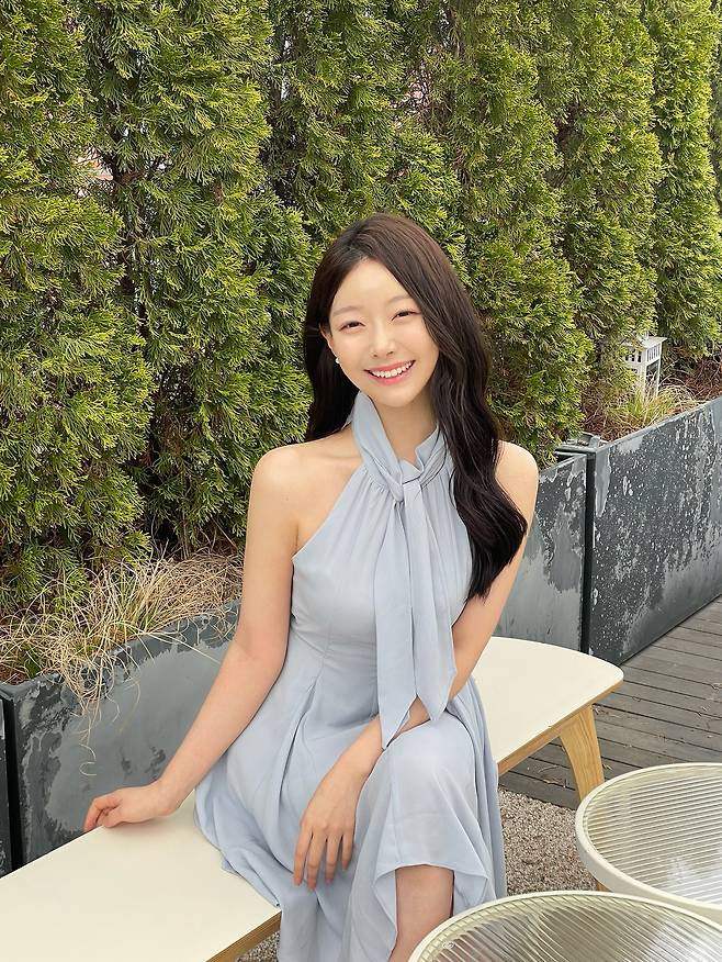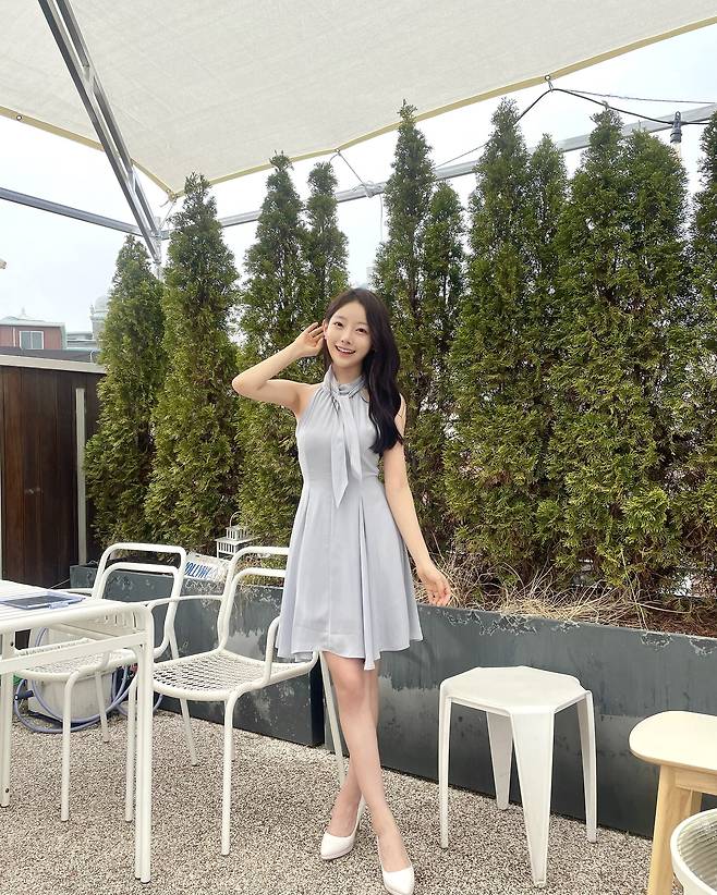 두 번째는 걸을 때마다 실루엣이 살아나는 리본 홀터넥 원피스로 여름의 낭만을 입은 듯한 느낌을 주는 코디,