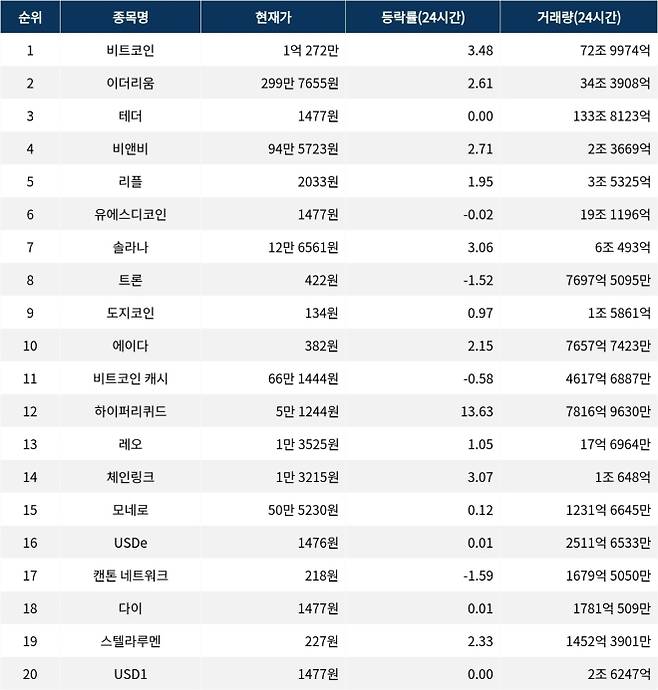 같은 시각 다이는 1477원으로 0.01% 상승했다. 시가총액은 7조 9289억원이다. 스텔라루멘은 227원으로 2.33% 상승했다. 시가총액은 7조 4963억원이다. USD1은 1477원으로 변동이 없었다. 시가총액은 6조 7894억원이다.