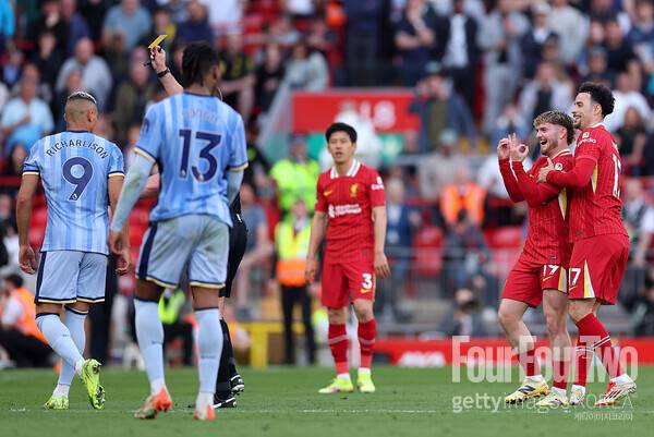 결국 히샬리송과의 신경전에서 패배할 위기에 처한 엘리엇이다. 엘리엇은 리버풀의 조기 우승을 확정 지은 경기였던 프리미어리그(PL) 34라운드 토트넘 홋스퍼전에서 히샬리송과 설전을 주고 받았다. 후반 추가시간, 엘리엇은 히샬리송의 다리 사이로 공을 통과시키며 시간을 끌었다. 이에 신경전이 펼쳐졌는데, 그는 히샬리송을 향해 손가락으로 ‘30’을 만들며 비웃었다. 히샬리송의 ‘친정’ 에버턴이 30년간 무관에 바져 있다는 의미였다.