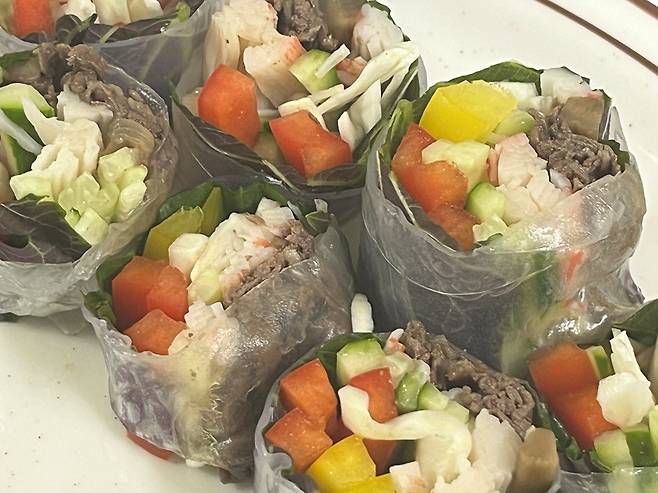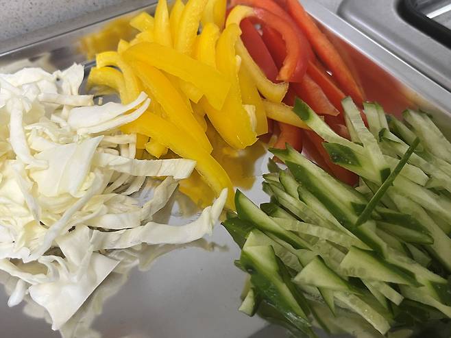 흔히 월남쌈이라고 하는 야채 쌈을 만들 텐데요. 월남쌈은 재료는 평범하지만 다 합쳐서 먹으면 정말 특별한 맛이 납니다. 야채는 파프리카, 오이, 당근 등 아무거나 넣어도 좋습니다.