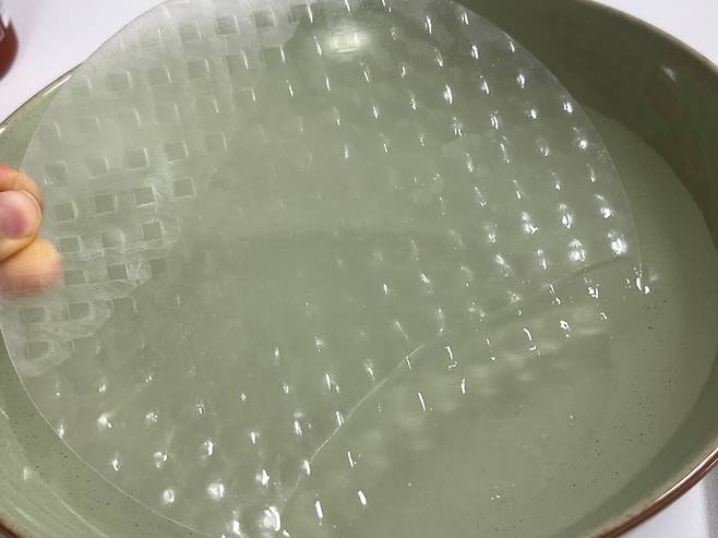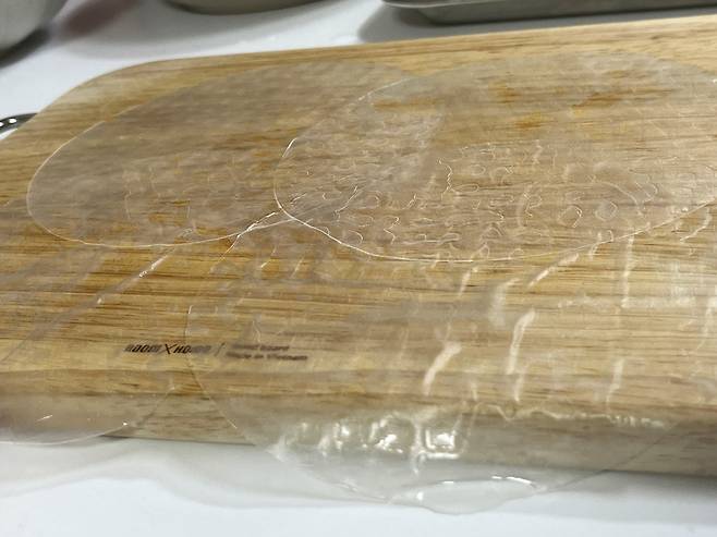 라이스페이퍼 4장을 찬물에 5초간 적신 다음 잘 겹쳐서 깔아 주세요. 아랫부분이 살짝 밖으로 튀어나오게 놓으면 나중에 감쌀 때 편합니다.