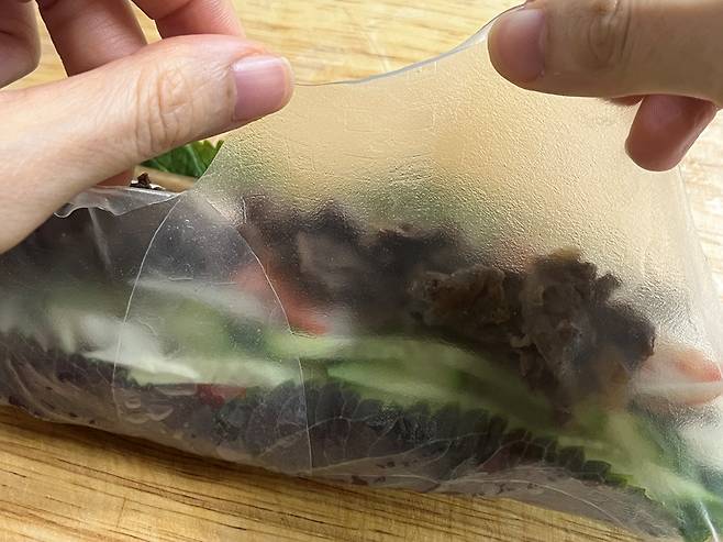 라이스페이퍼가 끈적하기 때문에 김밥처럼 마는 데 별로 어렵지 않더라고요. 라이스페이퍼를 쫙 당겨서 재료들을 꽁꽁 감싸주세요.