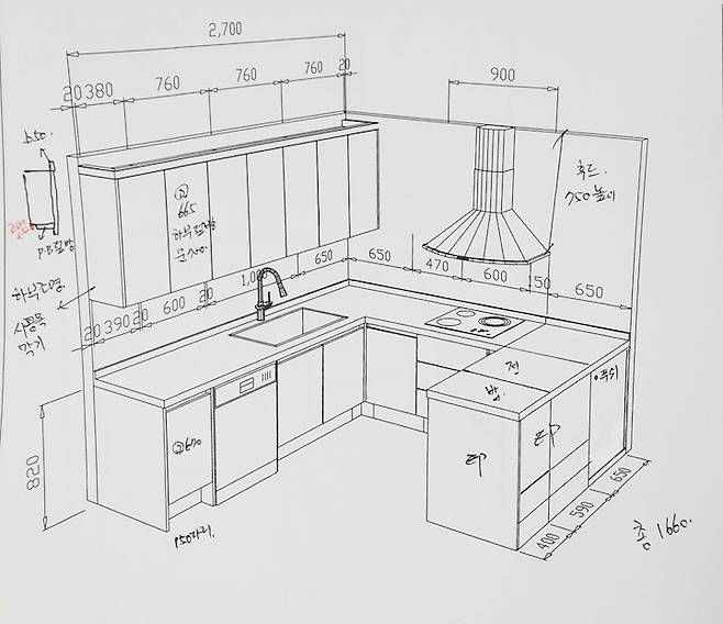 싱크대 제작 도면입니다. 이 공간 역시 거실에서 주방을 바라보았을 때 좁다는 느낌이 들지 않도록 한쪽 상부장을 없애기로 하였습니다. 맞춤으로 제작한 가장 큰 이유는 비효율적으로 남는 공간을 없게 하기 위함이었어요. 수납장은 현재 사용하고 있는 밥솥과 전자레인지 사이즈에 딱 맞추어 제작하였고 나머지 공간은 다 수납공간으로 사용 할 수 있도록 제작했어요.