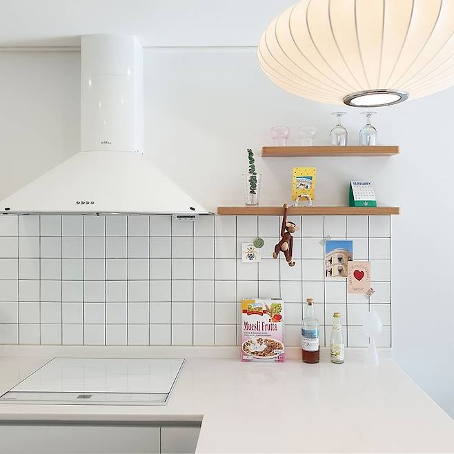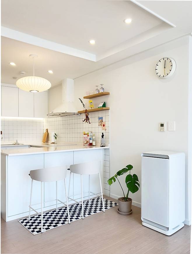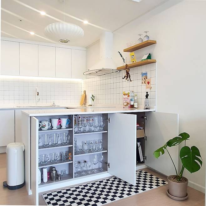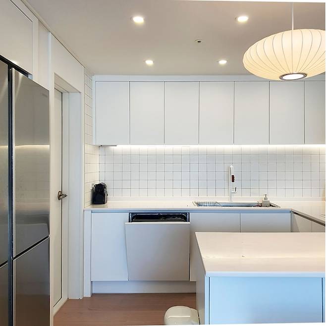주방 역시 화이트 베이스 공간입니다. 모자이크 타일 너무 귀엽지 않나요?
