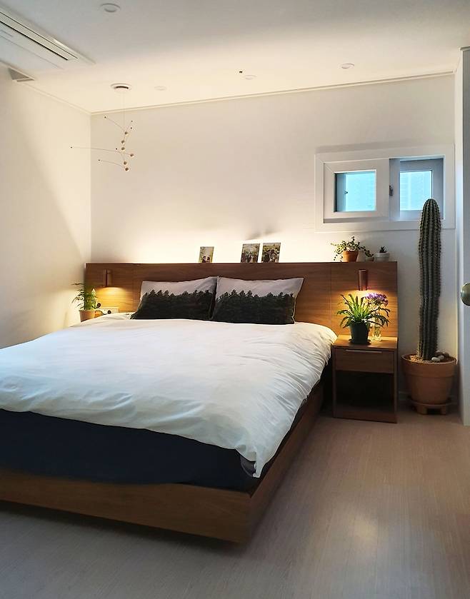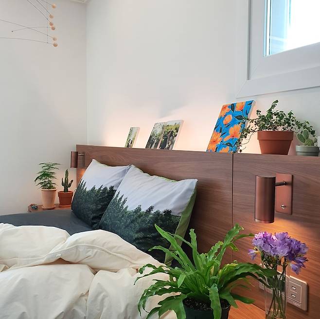 거실과 전혀 다른 우드와 플랜테리어 분위기의 침실 공간입니다.