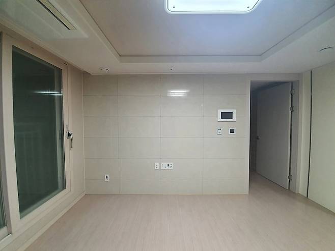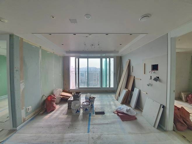 사진 기준 오른쪽 벽이 아트월 TV 자리었으나 딱히 요즘스럽지 않아 철거하였습니다. 그리고 기존 소파에 앉으면 앞 동 뒷면이 보여서 왼쪽 벽에 석고보드로 보강하여 TV 설치 위치를 바꾸었습니다.