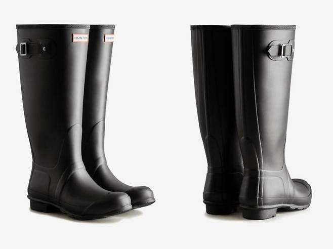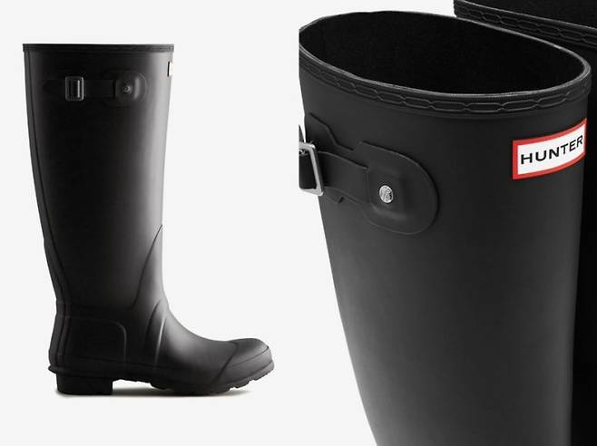 착용한 제품은 헌터의 Women's Original Wide Tall Wellington Rain Boots로, 와이드 핏과 러버 소재, 미끄럼 방지 아웃솔이 특징이다.