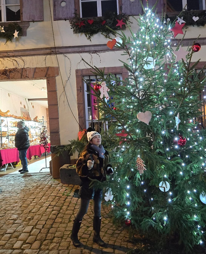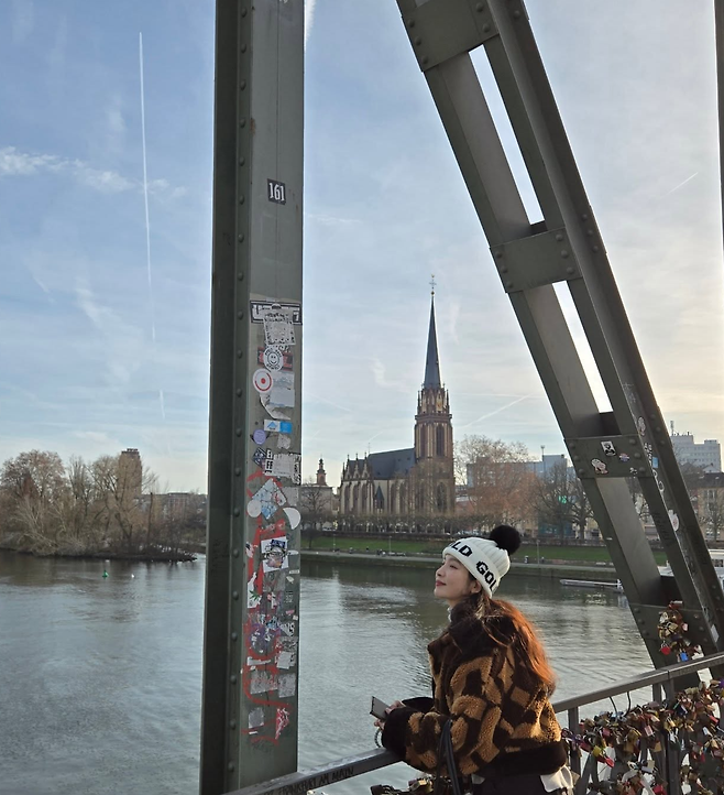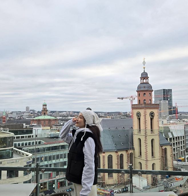 이민영은 유럽 여행 중 헌터 레인부츠를 매치한 모습을 공개했다.