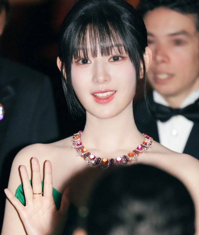 심플한 오프숄더 드레스에 볼드한 골드빛 네크리스가 더해지며 스타일에 강렬한 포인트를 주었어요. 목선을 따라 흐르는 듯한 디자인의 주얼리는 고급스러우면서도 예술적인 분위기를 더해주며, 김지원 특유의 청순한 이미지와 완벽한 균형을 이루었죠.