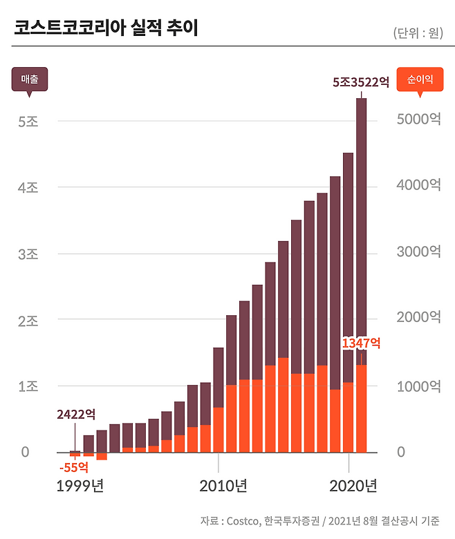 저 최근에 뉴스 보다가 깜짝 놀랐습니다. 바로 코스트코의 한국 매출이 5조 원을 돌파했다는 소식이었습니다! 2021 회계연도 기준 매출이 5조 3522억 원이라고 하네요. 1998년 한국 진출 이후 가장 높은 수치입니다. 전년 대비 18.3% 성장한 거고요.