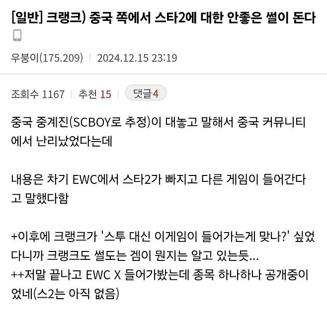 아니 그보다 체스가 e스포츠는 맞냐... 애초에 e스포츠에서 RTS가 얼마나 상징적인 장르인데 E스포츠의 태동이 RTS로, 스타크래프트로 시작했었는데 참 착잡하다...
