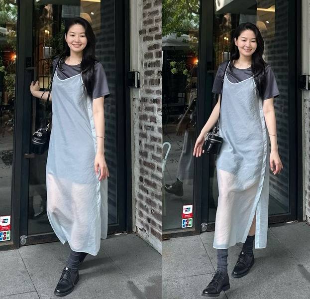 류이서는 심플한 블랙 미니 원피스에 시스루 롱 원피스를 레이어드해 모던하면서도 독특한 나들이룩을 연출했습니다.