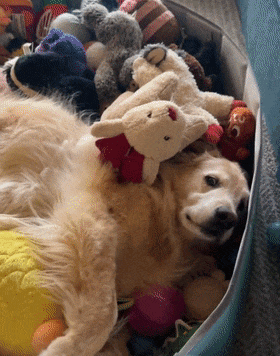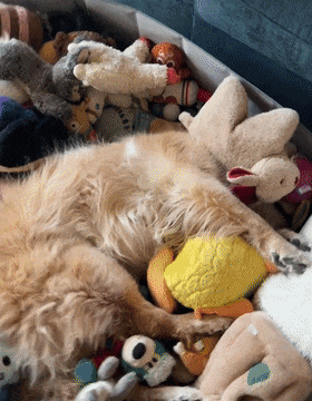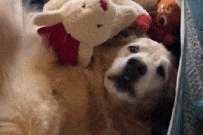 장난감 바구니 안에서 머리를 파묻고 자고 있었습니다. 주인이 불러보지만 비몽사몽 잠시 쳐다만 볼 뿐 전혀 반가워하지 않았습니다!