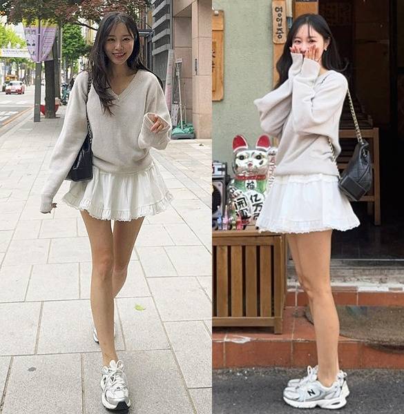 이솔이는 베이지빛 브이넥 니트에 러플 포인트가 더해진 화이트 캉캉 미니스커트를 매치해 발랄한 무드를 연출했습니다.