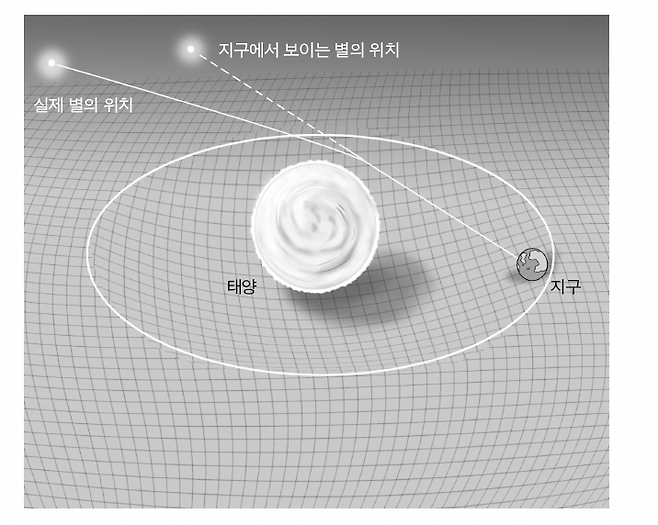 예를 들어, 지구-태양-별이 일직선상에 있다고 해봅시다. 상식적으로 지구에서는 태양 너머의 별이 보이지 않아야 합니다. 큰 물체에 가려 뒤쪽 물체가 가리지 않는 것처럼요. 그런데 지구에서 이 별을 볼 수 있었던 것이죠. 태양처럼 질량이 큰 천체를 지날 때 공간 자체가 왜곡되기 때문입니다.