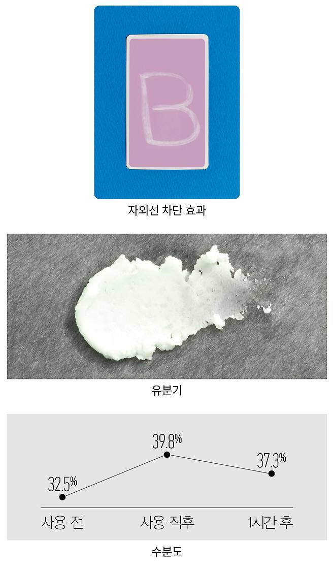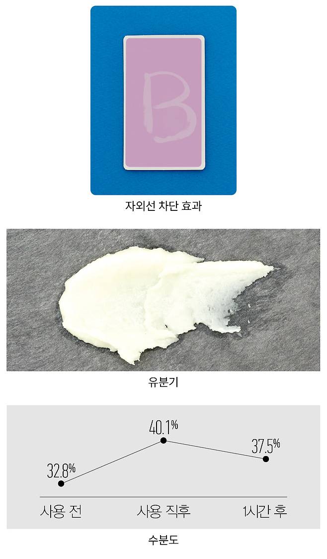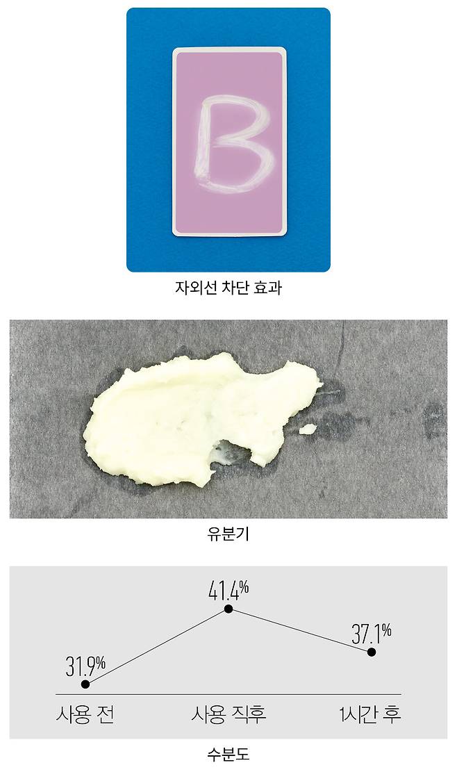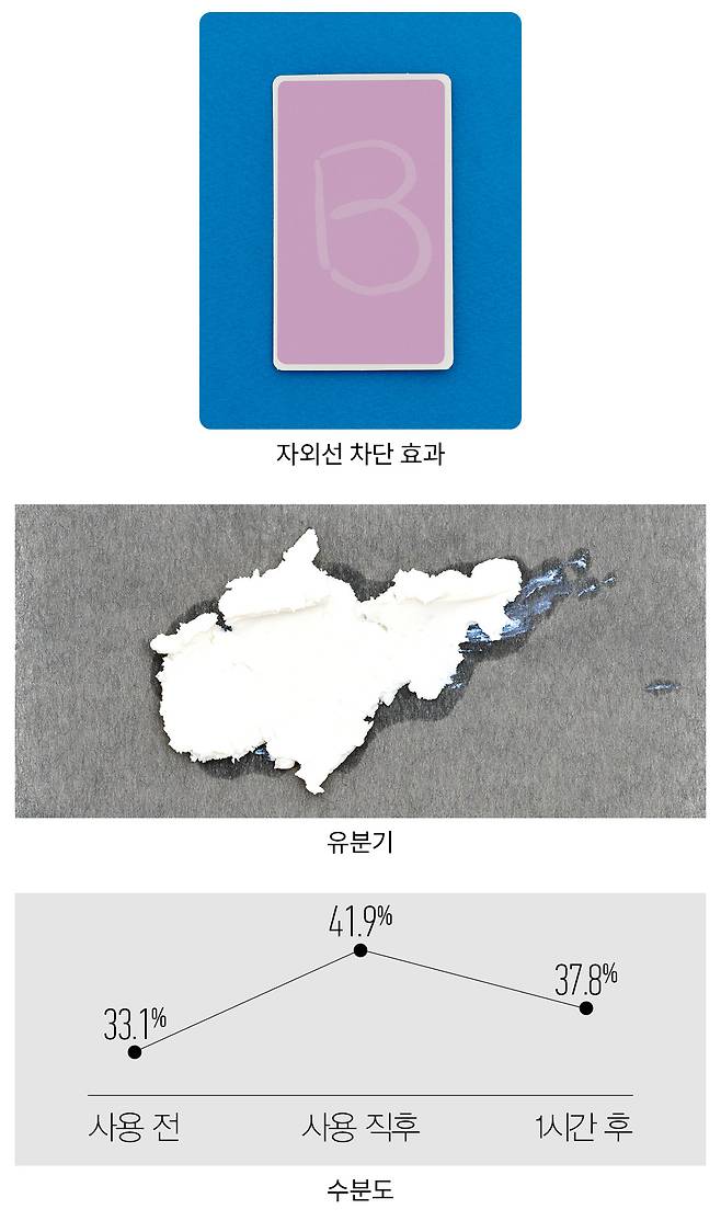 방법 자외선을 받으면 보라색으로 변하는 UV 감지 카드에 제품을 바르고, 자외선 램프에 5분간 노출시킨 뒤 변화를 확인한다.
