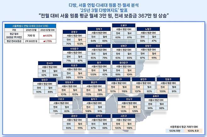 국내 부동산 정보 플랫폼 ‘다방’이 ‘3월 다방여지도’를 발표했다. ‘다방여지도’는 국토부 실거래가 데이터를 기반으로 자치구별 평균 전세 보증금과 월세 수준을 서울 전체 평균과 비교해 한눈에 확인할 수 있도록 만든 지도다. 서울 평균 시세를 100%로 설정해, 이보다 높으면 해당 자치구의 원룸 시세가 평균 이상이라는 뜻이다.