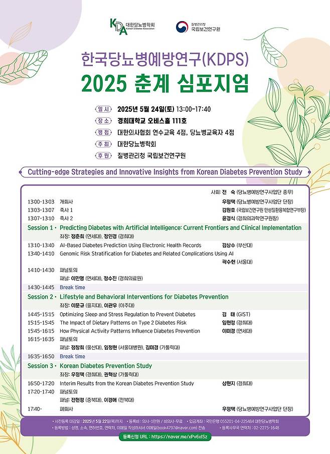 대한당뇨병학회가 주최하고 질병관리청 국립보건연구원이 후원하는 이번 심포지엄은 총 3개의 세션(▲인공지능을 활용한 당뇨병 예측: 최신 연구 동향과 임상 적용 ▲당뇨병 예방을 위한 생활습관 및 행동 중재 ▲한국당뇨병예방연구)으로 구성되어 있으며, 경희대병원을 비롯한 국내 10여개 의료기관의 교수진이 좌장 및 연자로 나선다.