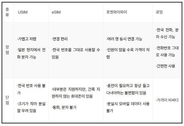 일본 여행을 준비하면서 데이터와 와이파이 중 고민이 되실텐데요. 일본 여행을 가서 모바일 데이터를 사용하는 방법은 총 네 가지가 있습니다. 아래의 표를 통해 장단점을 비교해 보세요.
