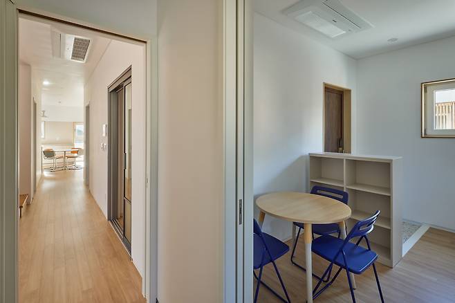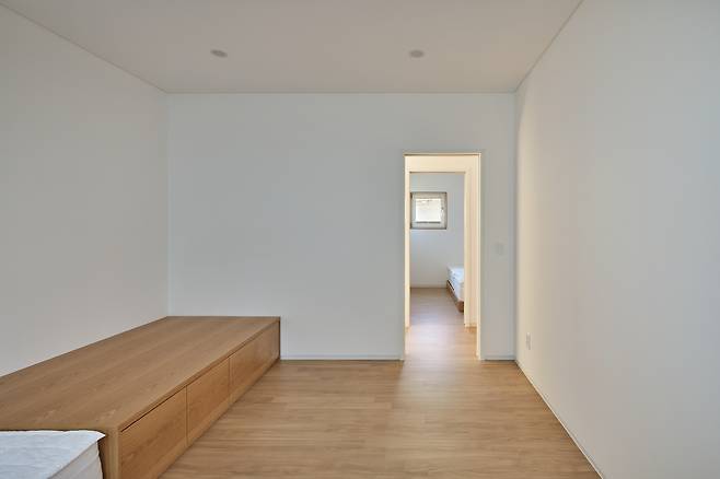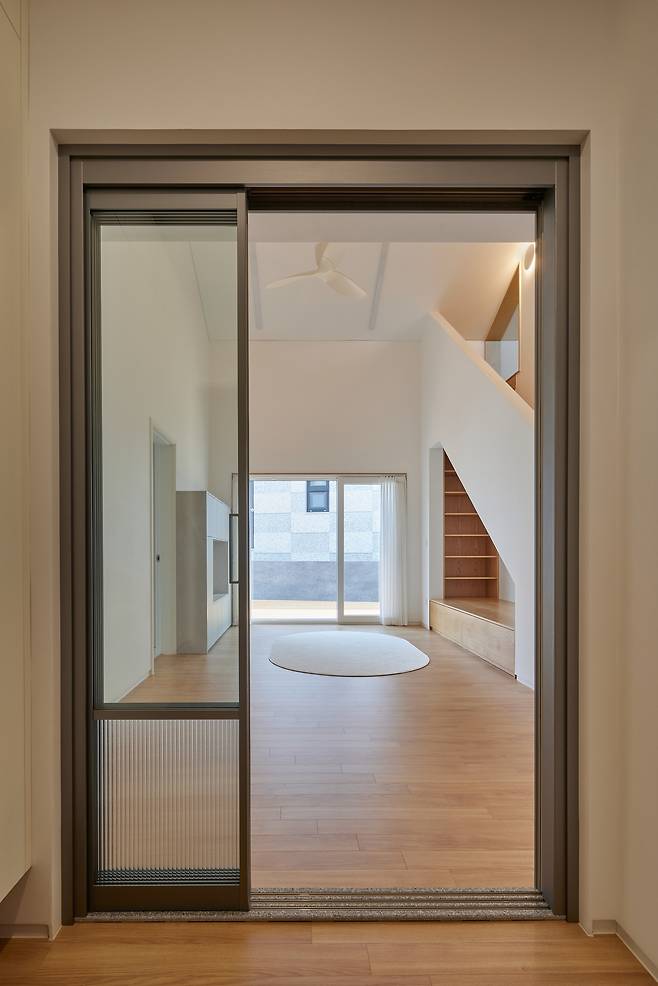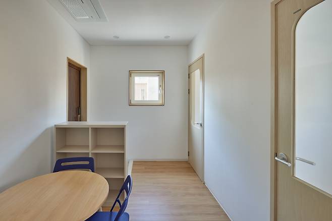 현관에는 두 개의 문이 있는데 하나는 아내의 수업공간으로 향하고, 나머지 하나는 주거공간으로 향한다. 특히, 거실을 중심으로 오른쪽에 화장실과 파우더룸을 배치해 문을 닫으면 주거공간과는 철저하게 구분돼 생활 측면에서의 프라이버시도 확보했다.