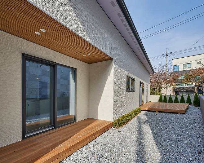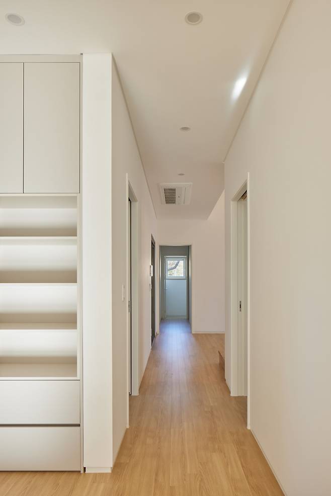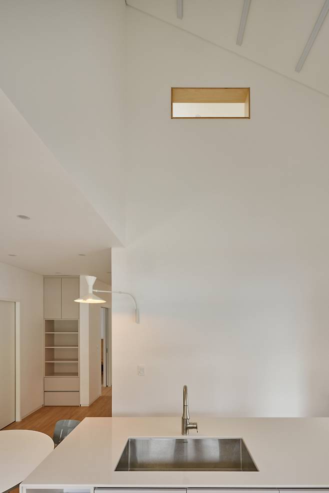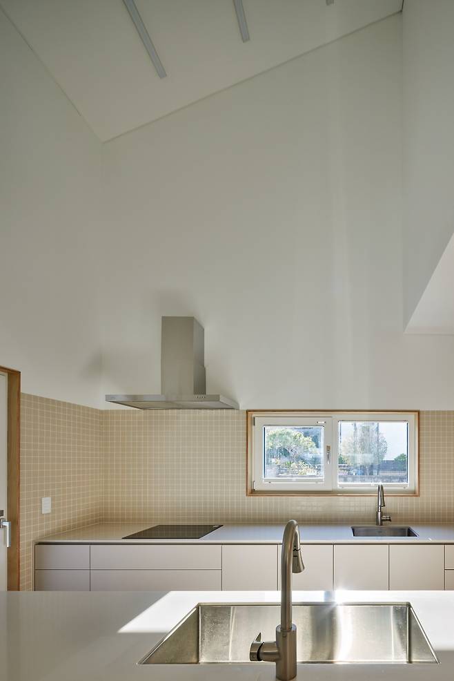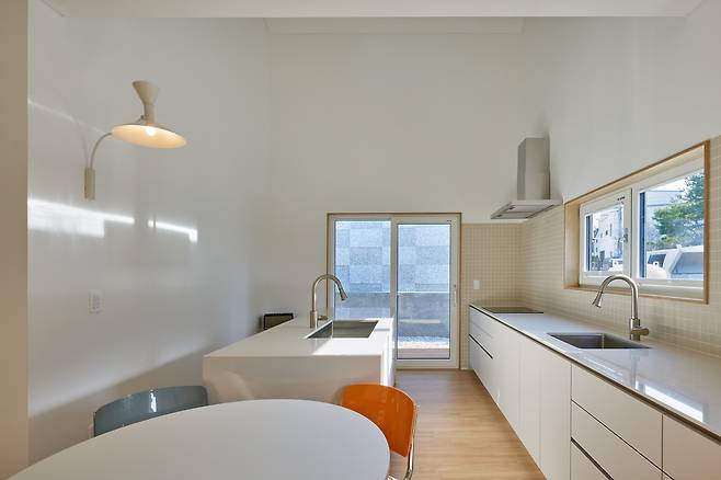 건축주는 아파트에 지내는 동안 거실과 주방이 가깝고 각 영역이 개방된 구조가 불편했던 경험을 덧붙이며, 주방과 거실은 분리되기를 바랐다. 이에 부부공간과 자녀공간을 가운데에 마주하고 양옆에 주방과 거실을 분리해 배치했다. 주방은 식당과 화장실, 작은 가족실을 연계함으로써 마치 또 하나의 작은방과 같은 아늑한 형태로 연출했다. 11자 주방을 계획해 편의성을 높였으며 상황에 따라서 확장된 형태로도 공간을 즐길 수 있도록 주방에서 바로 나갈 수 있는 테라스도 마련했다.