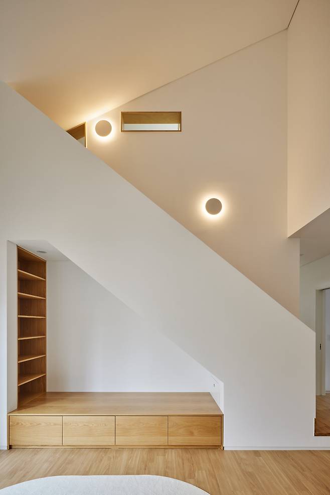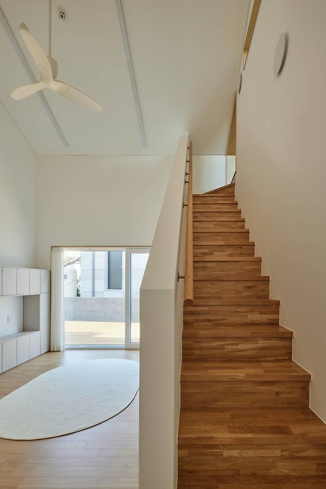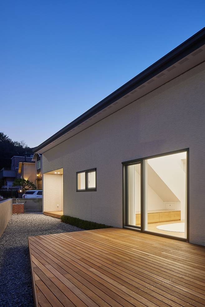 주방 반대쪽에 위치한 거실은 북쪽에 계획한 현관으로 진입해 남쪽 외부 데크로 연결된다. 한쪽 벽에는 다락으로 향하는 계단이 있고, 그 하부에는 자녀들과 함께 지낼 만한 평상 마루를 마련해 소파 없이도 가족들이 자연스럽게 모일 수 있도록 유도했다.