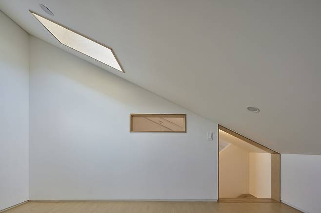 건축주는 음악을 전공한 아내가 집에서도 개인 수업을 할 수 있는 별도의 공간을 염두에 두고 대로변에 접한 대지를 선택했다. 그런 건축주의 생각에 맞춰 주거공간의 역할을 하면서도 수업공간이 구분되는 계획이 필요했다. 우선 법정 건폐율이 50%라는 이점을 살려 단층주택을 제안했다. 그리고 적절하게 동선이 분리되면서도 주어진 예산 안에서 낭비되는 공간이 없는 효율적인 배치를 고민했다. 오전~오후에는 아이들을 가르치는 수업공간이자 저녁에는 가족이 사용하는 공간이 되도록 멀티룸을 계획하기로 했다. 또 두 딸을 위한 다락도 추가로 마련하기로 했다.