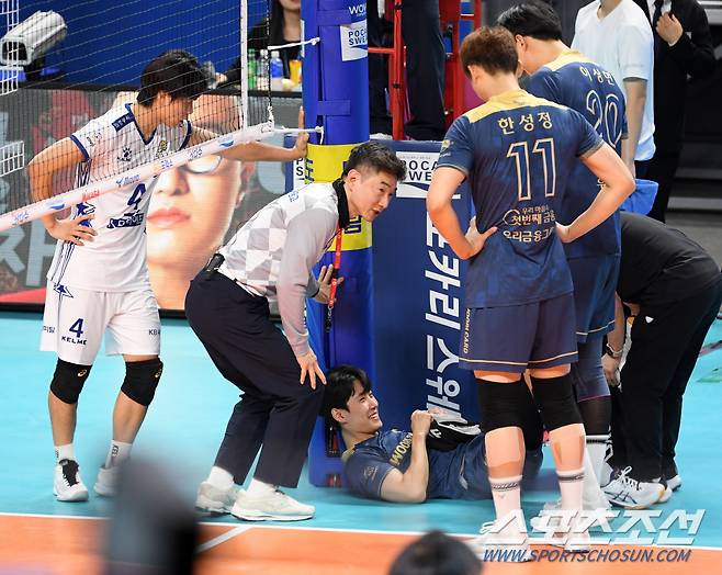 27일 장충체육관에서 열린 V리그 우리카드와 KB손해보험의 경기. 우리카드 세터 한태준이 토스를 올린 뒤 착지하는 과정에서 넘어져 통증을 호소하고 있다. 장충=박재만 기자 pjm@sportschosun.com/2023.12.27/