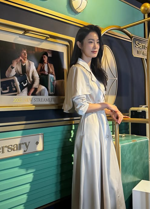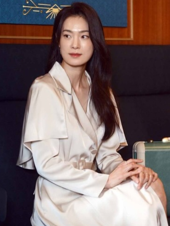 옥자연은 실크 소재의 실버 컬러 트렌치코트 원피스를 착용했는데요. 은은한 광택이 도는 실버 톤의 원피스는 그녀의 지적이면서도 우아한 분위기를 그대로 담아냈습니다. 어깨에는 케이프 디테일이 더해져 클래식한 느낌을 강조했고, 허리엔 벨트가 있어 슬림한 실루엣을 완성했죠.