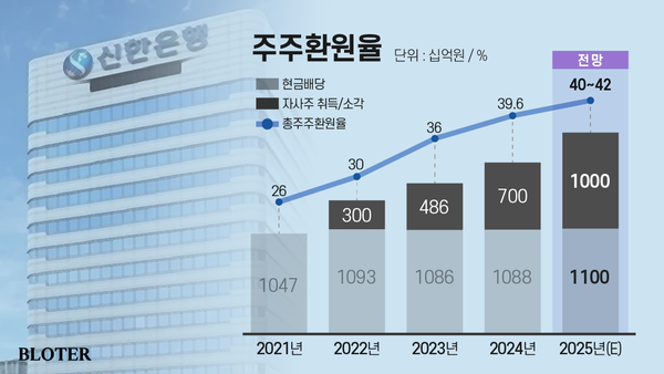 신한금융 배당규모(2조5000억원)는 주주환원 재원(2조1000억원)과 비교해 4000억원 크다. 주주환원을 위한 준비가 충분한 것다. 신한금융이 올해 주주에게 돌려줄 금액을 보면 분기 균등배당을 통해 1조1000억원에 더해 상반기 자사주 매입·소각 6500억원(작년 4분기 발표분 1500억원 포함)과 하반기 추가 자사주 매입·소각 5000억원 안팎 수준이다.