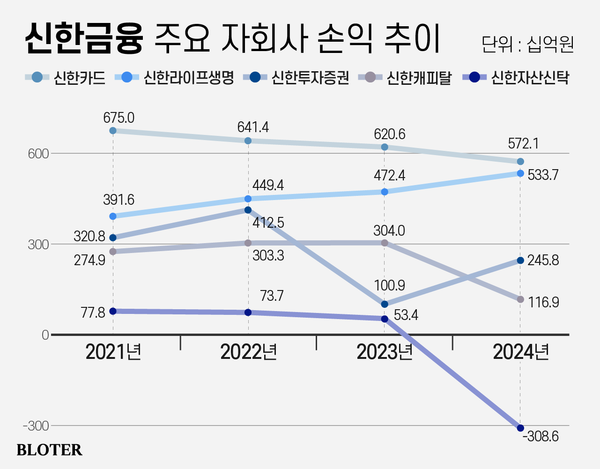 신한카드는 건전성 지표가 악화하며 대규모 대손비용이 발생해 순이익이 감소했고 신한투자증권은 지난해 순이익 2458억원을 올려 2023년보다 2배가 넘는 성장을 이뤘지만 1300억원 손실 등을 고려하면 아직 정상화된 이익체력을 보이지 못하고 있다.
