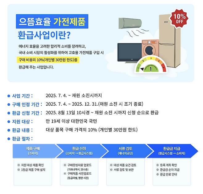 2025년 ‘으뜸효율 가전제품 환급사업’이 본격적으로 시작됐습니다. 올해 7월 4일 이후 에너지 효율이 높은 가전제품을 구매한 소비자라면, 구매 금액의 10%(개인별 최대 30만 원)를 돌려받을 수 있는 기회입니다. 산업통상자원부가 주관하는 이번 사업은 가계 부담을 줄이고 에너지 절약을 장려하기 위해 마련됐으며, 2,671억 원의 예산이 투입됐습니다. 환급 신청은 8월 13일 오전 10시부터 선착순으로 접수되며, 예산이 소진되면 조기 종료됩니다.