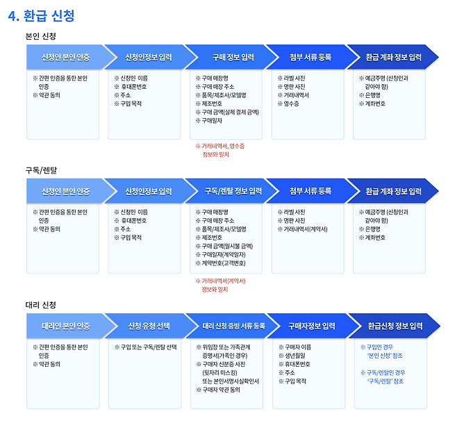 환급 신청 시 유의할 점은 신청 대상 제품의 등급 요건 충족 여부와 서류의 명확성입니다. 특히 라벨·명판·영수증·거래내역서의 정보가 일치해야 심사에서 반려되지 않습니다. 또한 사진은 제품 정보가 선명히 보이도록 촬영해야 합니다.
