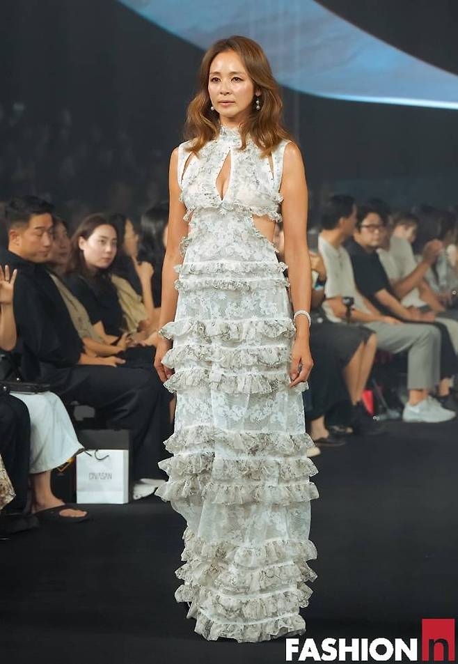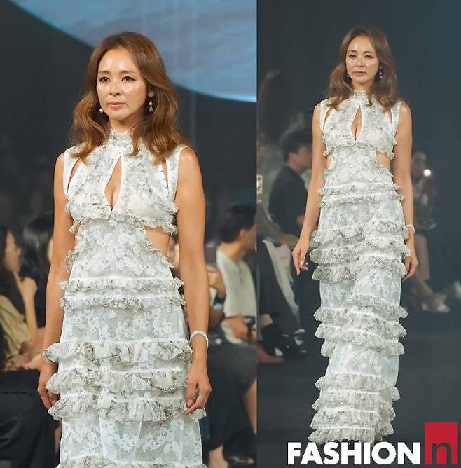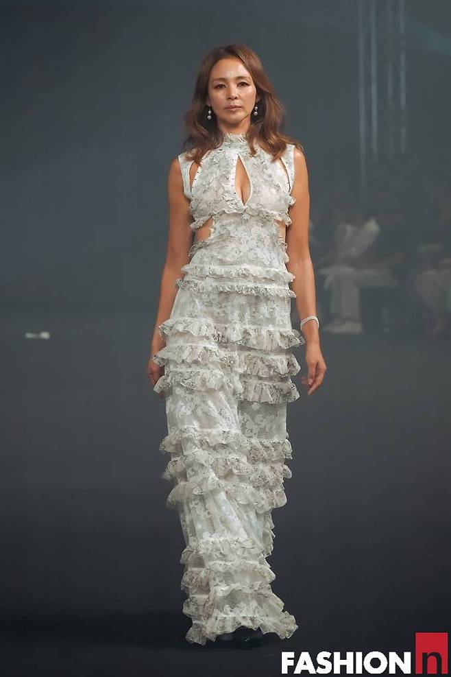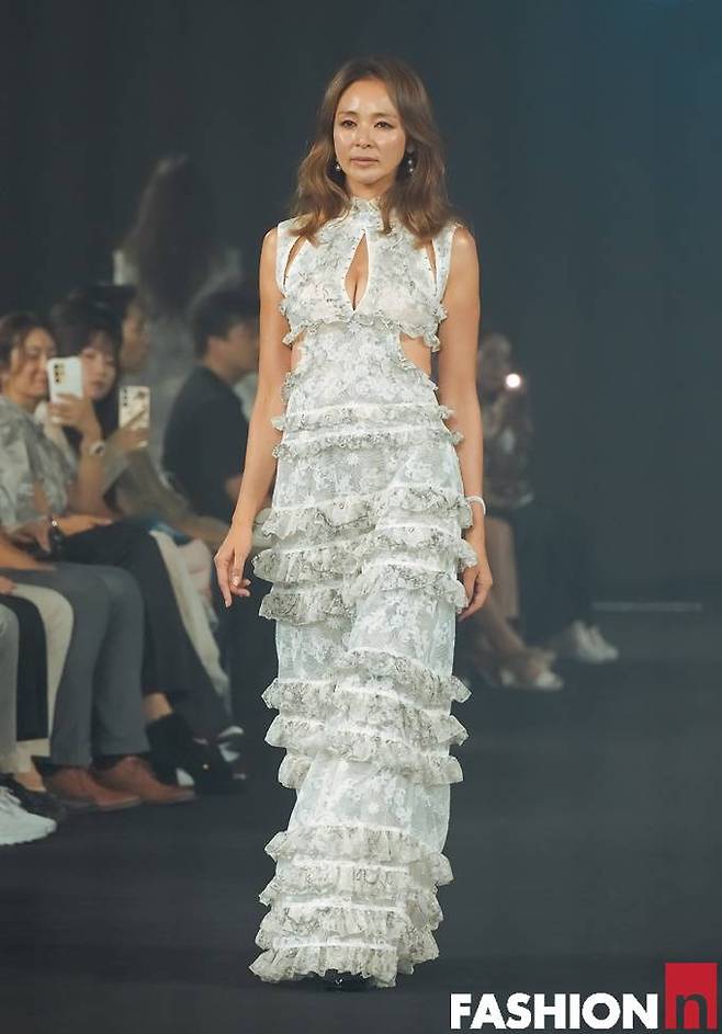 이날 야노시호는 로맨틱한 러플과 레이스 장식이 돋보이는 컷아웃 드레스룩으로 런웨이 무대를 질주하며 원조 모델의 위엄을 발산했다.