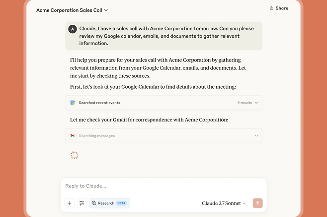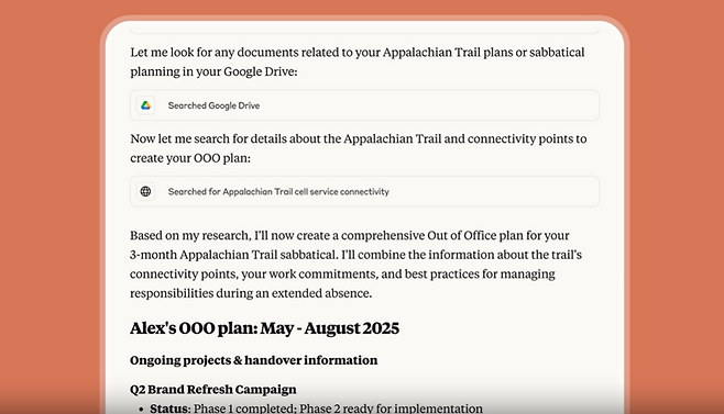 앞으로 클로드가 구글 문서뿐만 아니라 지메일, 캘린더에 접근할 수 있게 됐다. 클로드는 이메일을 검색하고 문서를 검토하는 작업을 수행할 수 있다.