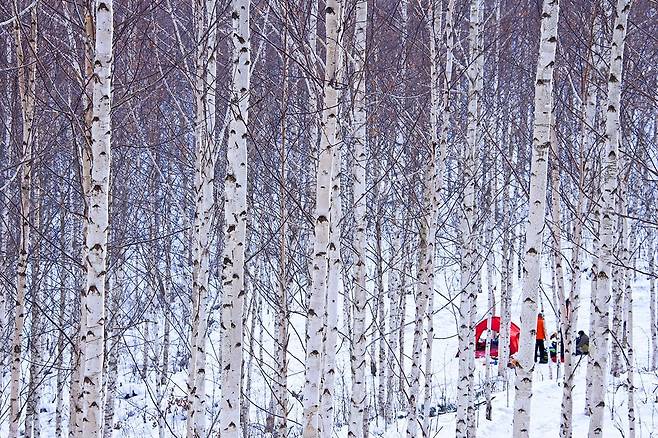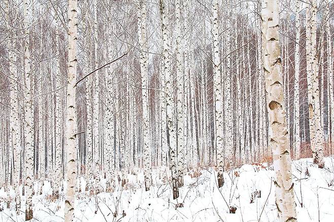 하얀 자작나무들이 빽빽하게 늘어서 있어, 눈 덮인 숲길을 걸으며 고요한 자연과 마주할 수 있는 특별한 장소입니다.